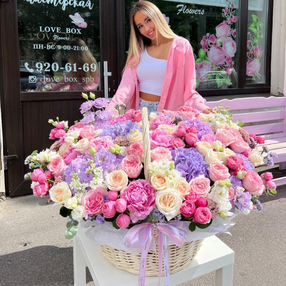 Гортензия – 4 шт.Роза пионовидная – 25 шт.Роза Эквадор – 20 шт.Пион – 10 шт.Роза кустовая – 10 шт.Лизиантус – 15 шт.Статица – 5 шт.Озотамнус – 6 шт.Корзина плетеная – 1 шт.Дизайнерская упаковка – 5 шт.