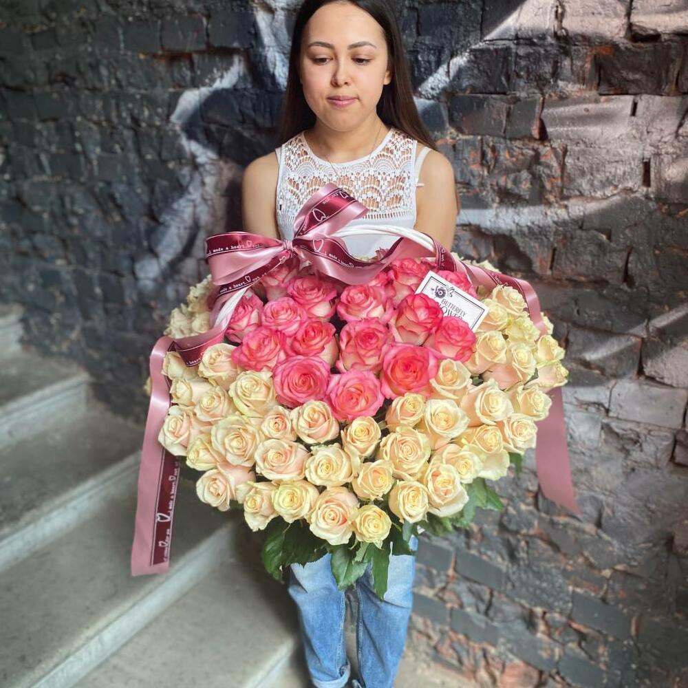 Метки: 101 роза, от 5000 руб, цветы в корзине