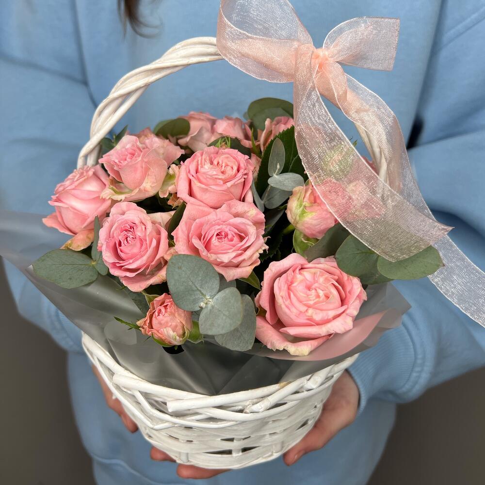 Роза кустовая пионовидная – 4 шт.Корзина плетеная – 1 шт.комплимент от polyanka – 1 шт.