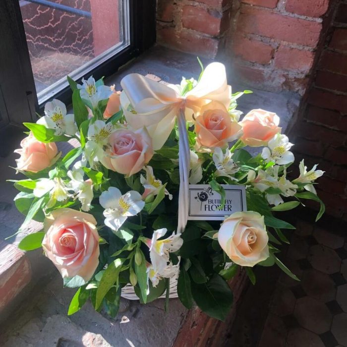 Корзина с персиковыми розами и альстромерией “Клодетт Колбер”