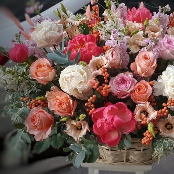 Корзина плетеная – 1 шт.Оазис флористический – 4 шт.зелень стаффаж пучок – 2 шт.мимоза листья – 10 шт.пионы – 10 шт.Маттиола – 10 шт.Роза одноголовая – 8 шт.Роза одноголовая пионовидная – 7 шт.Илекс – 7 шт.Эустома – 8 шт.Лагурус – 45 шт.Эвкалипт – 10 шт.