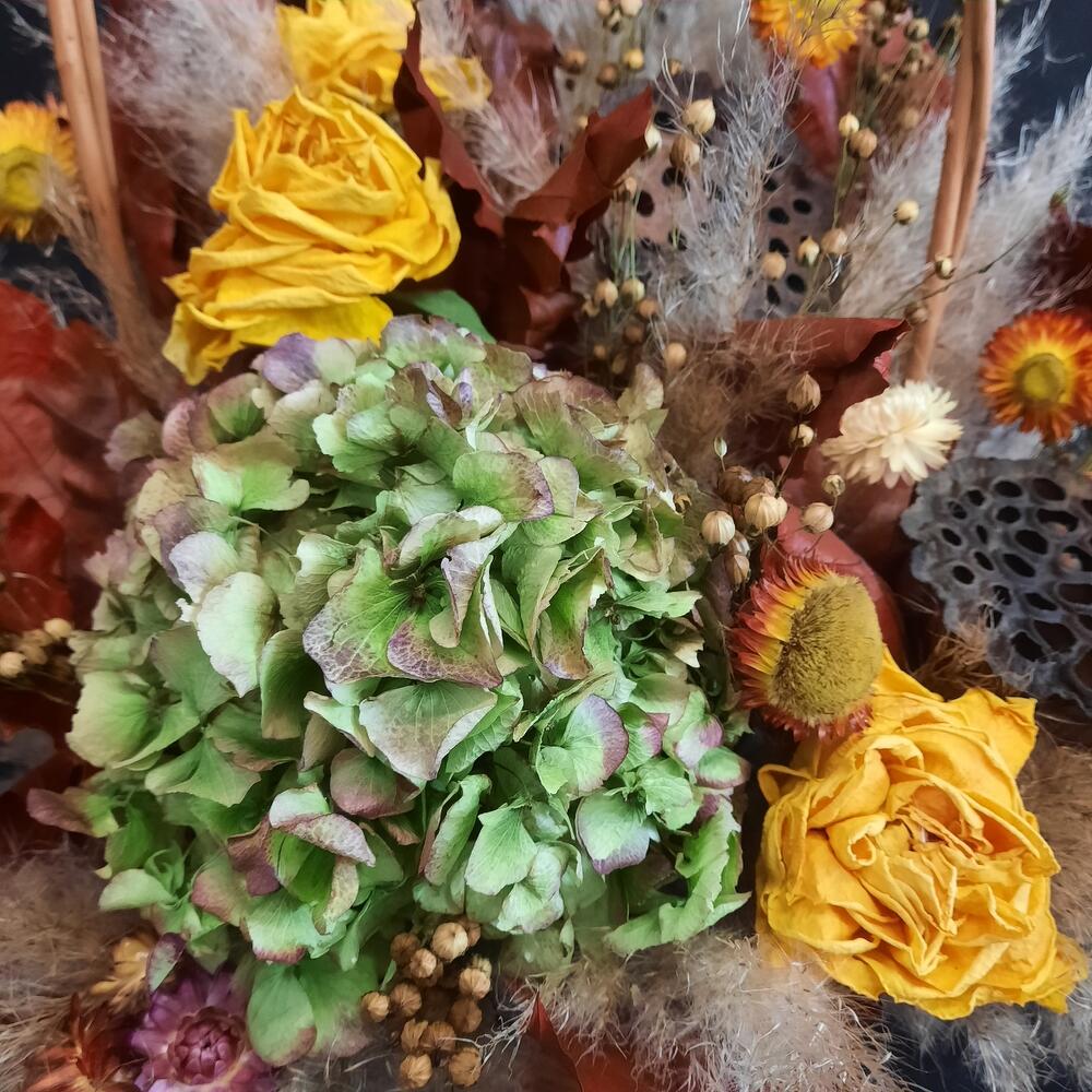 Роза – 3 шт.Лента атласная – 4 шт.Корзина плетеная – 1 шт.Лотос сухой – 2 шт.Оазис флористический – 1 шт.Гелихризум – 15 шт.Дубовые листья – 5 шт.кортадерия – 3 шт.лен пучок – 1 шт.