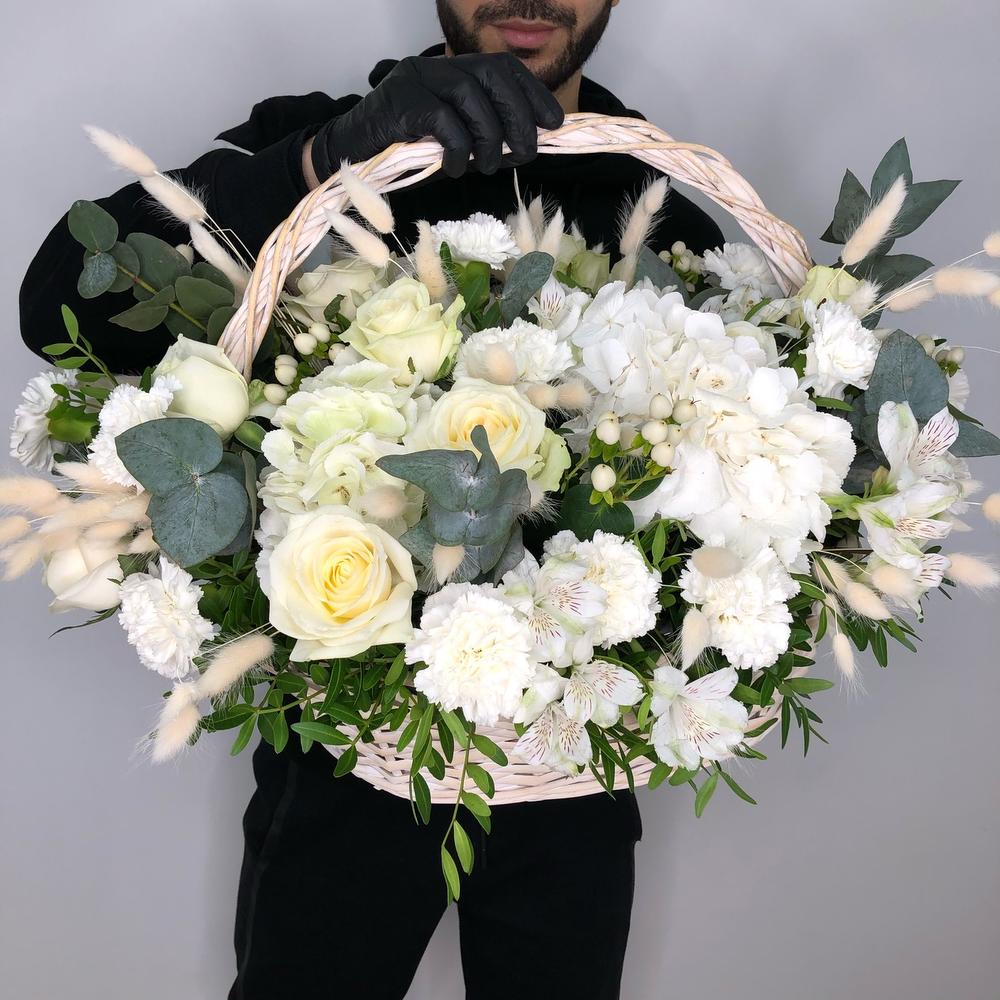 Альстромерия – 4 шт.Эвкалипт – 1 шт.Гортензия белая – 3 шт.Корзина плетеная – 1 шт.Гвоздика сортовая – 11 шт.Пистация – 5 шт.Оазис флористический – 1 шт.Роза белая аваланж – 13 шт.гиперикум кустовой белый – 5 шт.Ларгус (сухоцвет) – 5 шт.