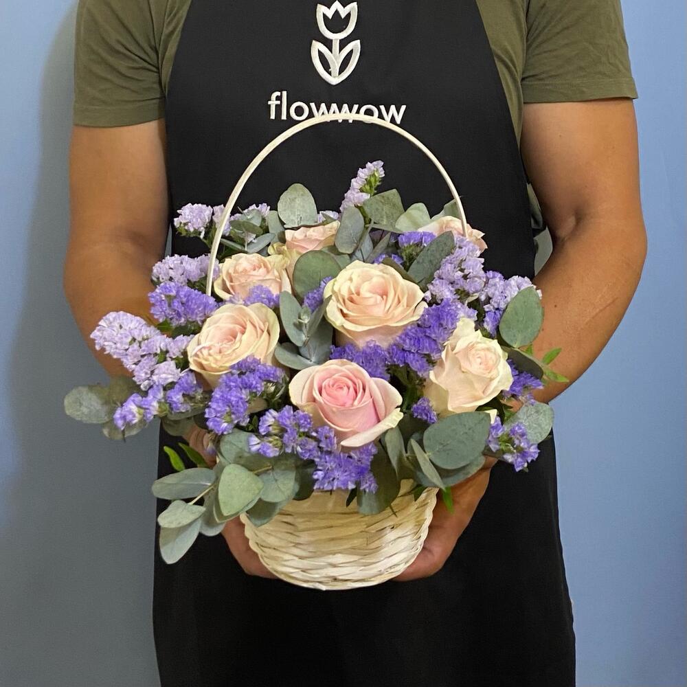 Роза Эквадор Премиум – 7 шт.Статица лавандовая – 3 шт.Эвкалипт – 5 шт.Корзина – 1 шт.