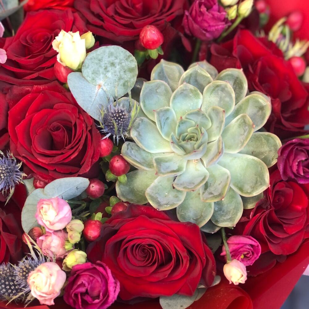 Орхидея Цимбидиум – 1 шт.Эрингиум – 8 шт.Роза – 13 шт.Хиперикум – 5 шт.Суккулент – 1 шт.Упаковка дизайнерская – 2 шт.Лизиантус – 5 шт.Эвкалипт ценерия – 2 шт.Фисташка – 10 шт.