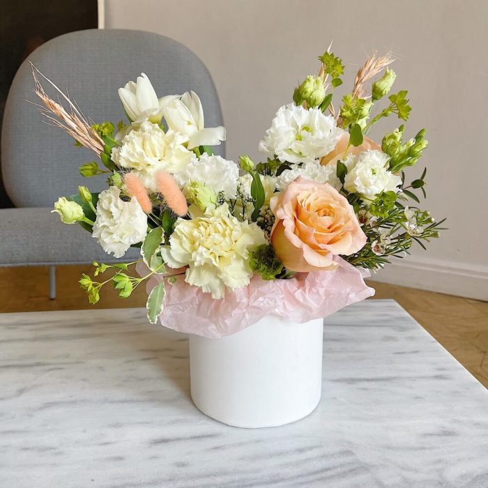 Роза персиковая – 2 шт.Тюльпан – 2 шт.Лизиантус – 1 шт.Диантус – 1 шт.Хамелациум – 1 шт.Буплерум – 1 шт.Питтоспорум – 1 шт.овес сухоцвет – 3 шт.Лагурус – 3 шт.Коробка шляпная – 1 шт.Губка флористическая – 1 шт.