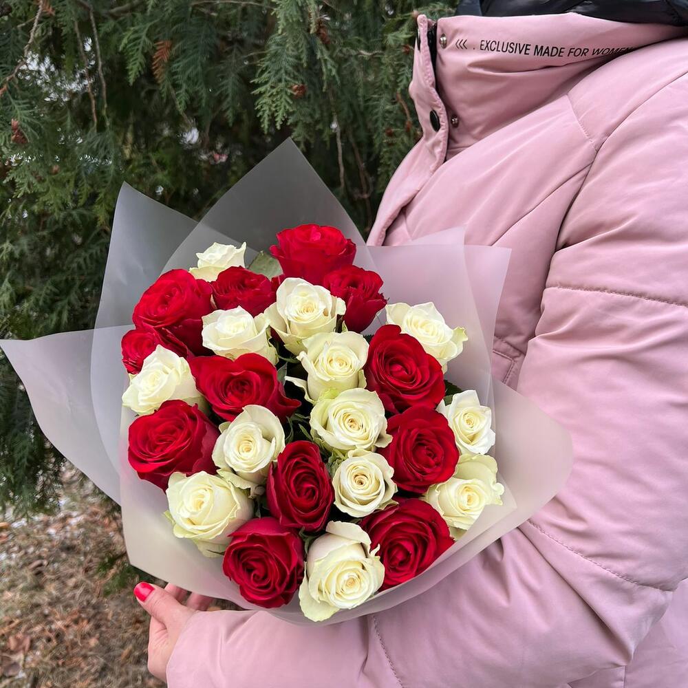 Роза красная – 13 шт.Роза белая – 12 шт.Пленка матовая – 1 шт.