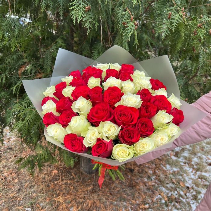 Роза красная – 26 шт.Роза белая – 25 шт.Пленка матовая – 1 шт.