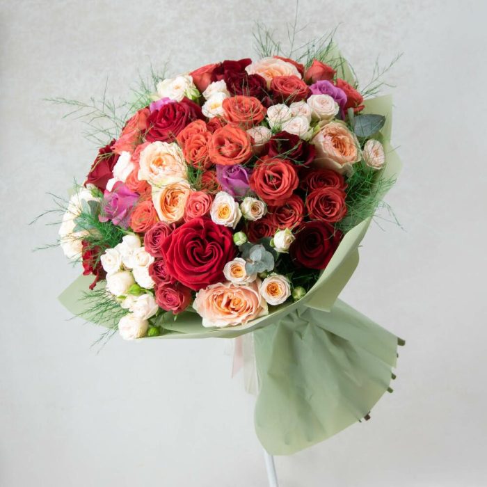 Альстромерии, Гвоздики, Кустовые розы, Лизиантусы, Розы, Хризантемы