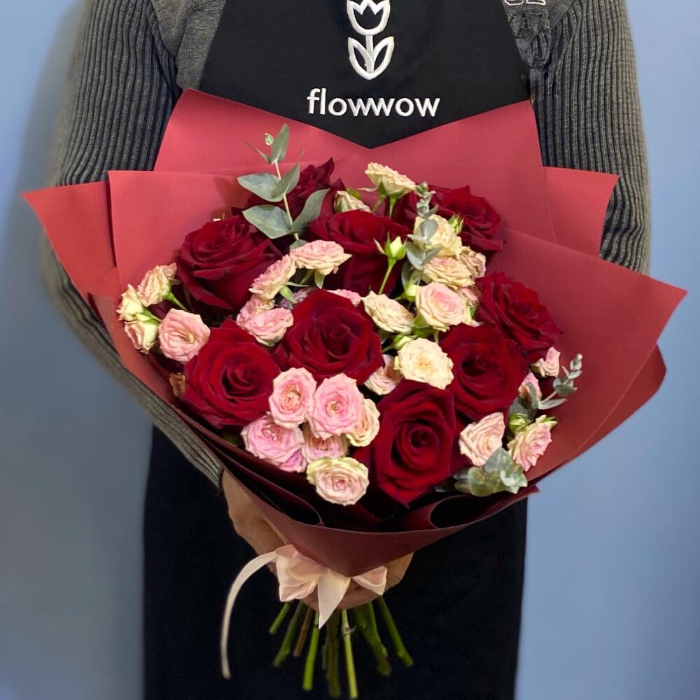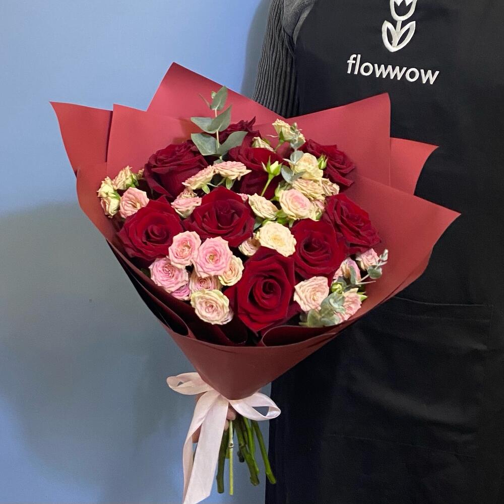 Роза Эквадор Премиум – 9 шт.Роза кустовая розовая – 6 шт.Эвкалипт – 3 шт.Упаковка – 1 шт.Лента атласная – 1 шт.