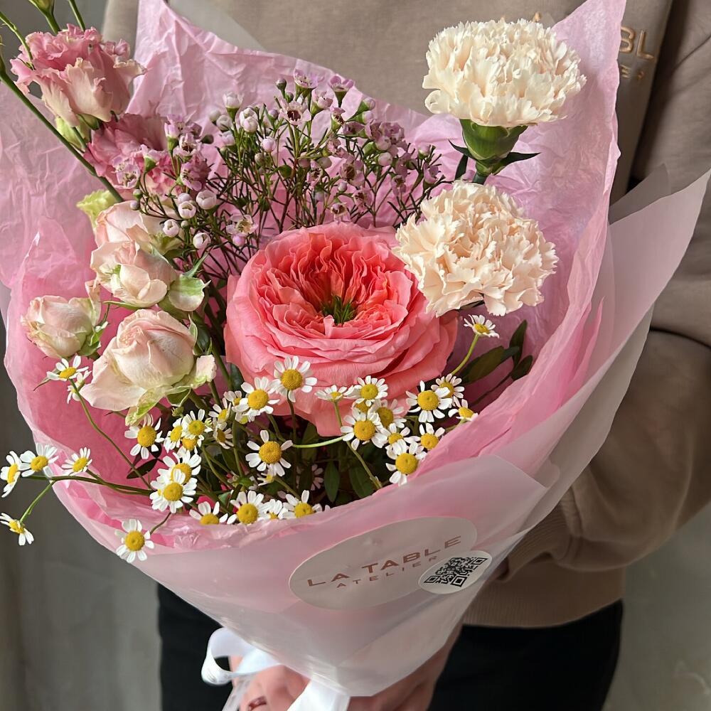 Пионовидная роза – 1 шт.Диантус – 2 шт.Кустовая роза – 1 шт.Ваксфлауэр – 2 шт.Эустома – 1 шт.Матрикария – 1 шт.Упаковка дизайнерская – 1 шт.