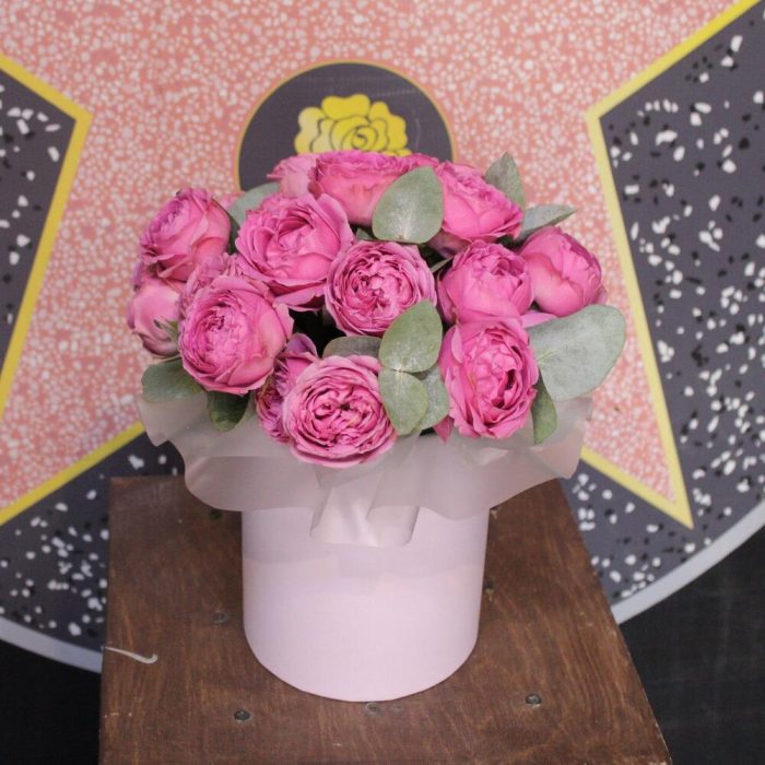 Эвкалипт – 2 шт.Коробка шляпная – 1 шт.Оазис флористический – 1 шт.Пленка дизайнерская – 1 шт.роза кустовая пионовидная мисти бабл – 7 шт.