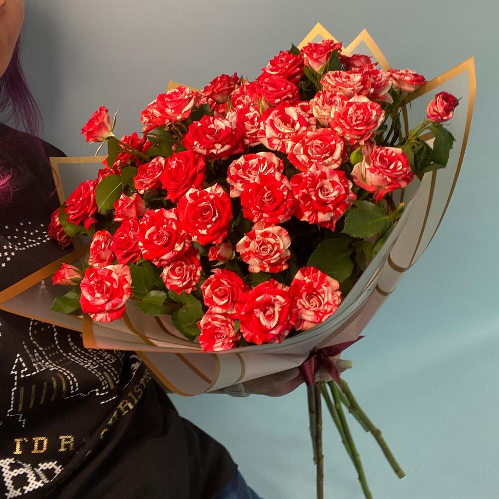 Кустовая роза – 7 шт.Упаковка дизайнерская – 2 шт.Лента атласная – 1 шт.