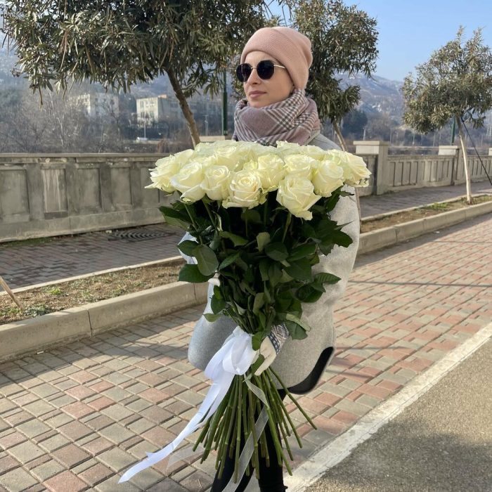 Роза белая – 35 шт. Атласная лента – 1 шт.