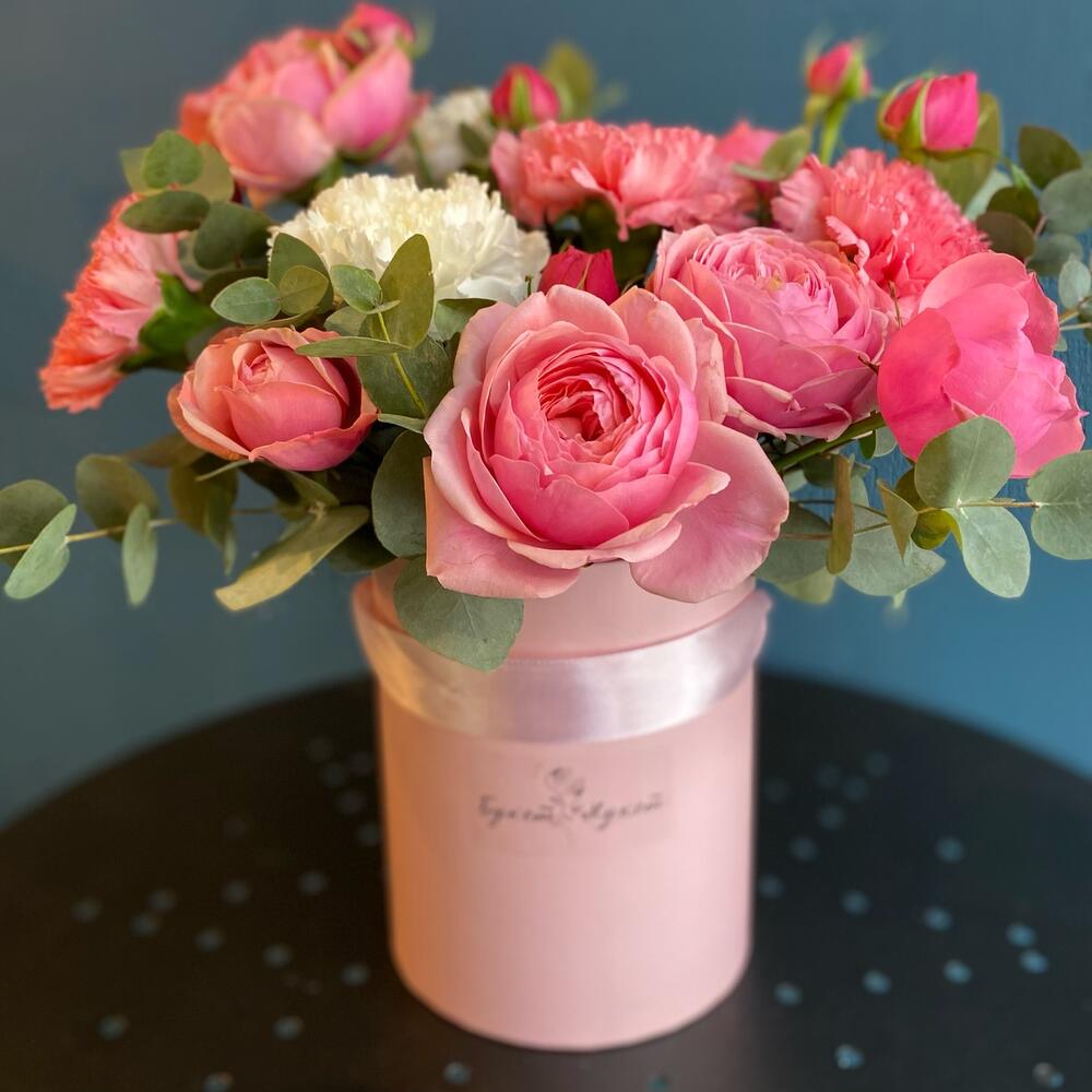 Эвкалипт – 1 шт.Диантус – 6 шт.Коробка шляпная – 1 шт.Роза пионовидная кустовая – 2 шт.Оазис флористический – 1 шт.