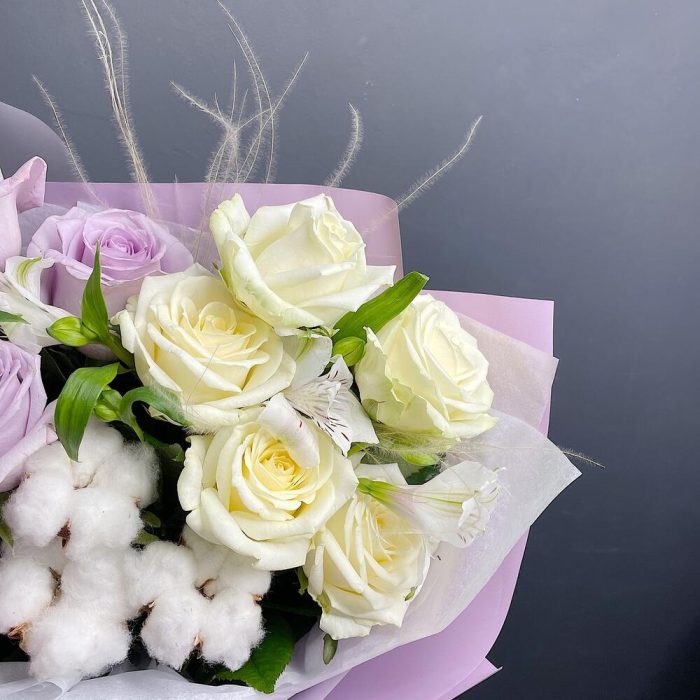 Альстромерия – 2 шт.Хлопок – 3 шт.Роза белая – 5 шт.Роза сиреневая – 7 шт.Упаковка дизайнерская – 1 шт.стифа пучок – 4 шт.