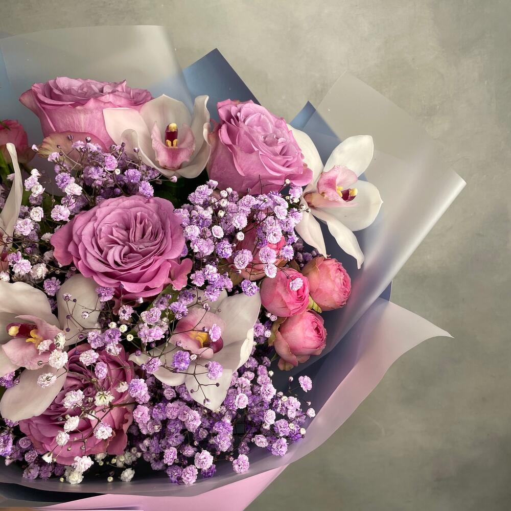 Гипсофила – 5 шт.Орхидея Цимбидиум – 5 шт.Роза кустовая – 2 шт.Упаковка дизайнерская – 1 шт.роза квинс краун – 6 шт.