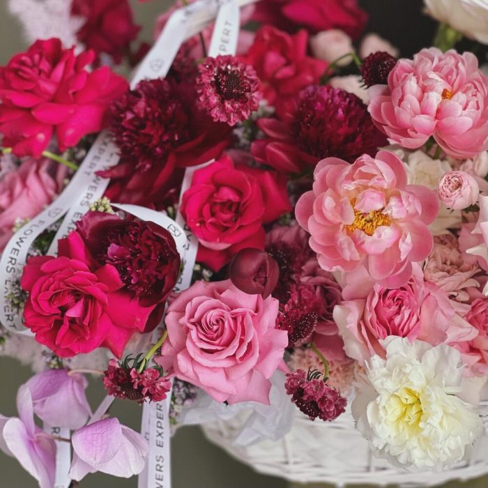 Пион – 5 шт.Сирень – 5 шт.Корзина плетеная – 1 шт.Французская роза – 19 шт.Фаленопсис – 1 шт.