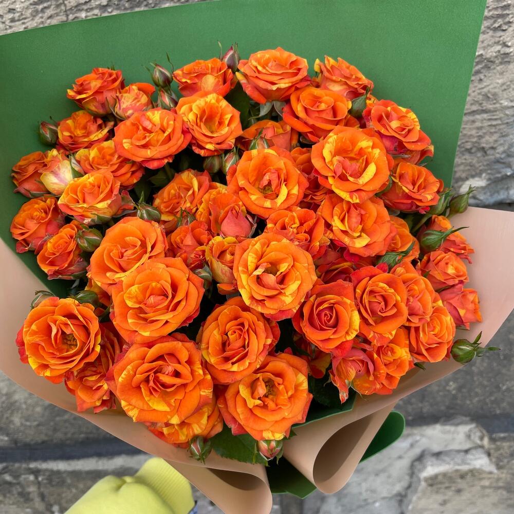 Роза кустовая – 9 шт.Фоамиран (упаковка) – 1 шт.Пленка дизайнерская – 1 шт.Лента атласная – 1 шт.