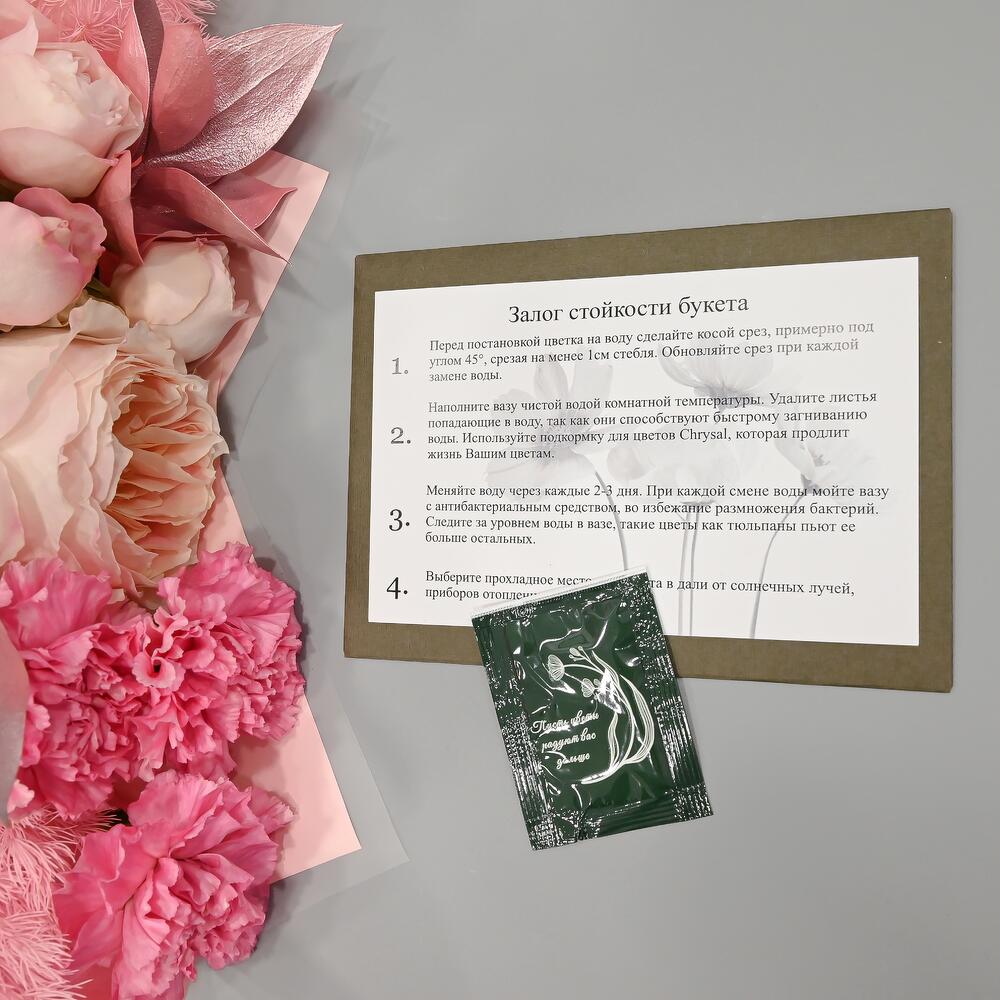 Нежный букет в розовой цветовой гамме. В составе пионовидная роза, кустовая пионовидная роза, похожая на пион, и сортовая гвоздика.Флористы студии Цветочный Этикет собрали его из самых свежих цветов, тщательно продумав состав. Букет готов удивлять красотой своего получателя! … Показать ещёСтанет идеальным подарком для любимой женщины, дочке или мамы, на День Рождения, юбилей, свадьбу и другие торжественные мероприятия. С букетом вы получите конверт с открыткой, в которой мы напишем любое пожелание, инструкцию свежести и средство для продления жизни срезанных цветов.