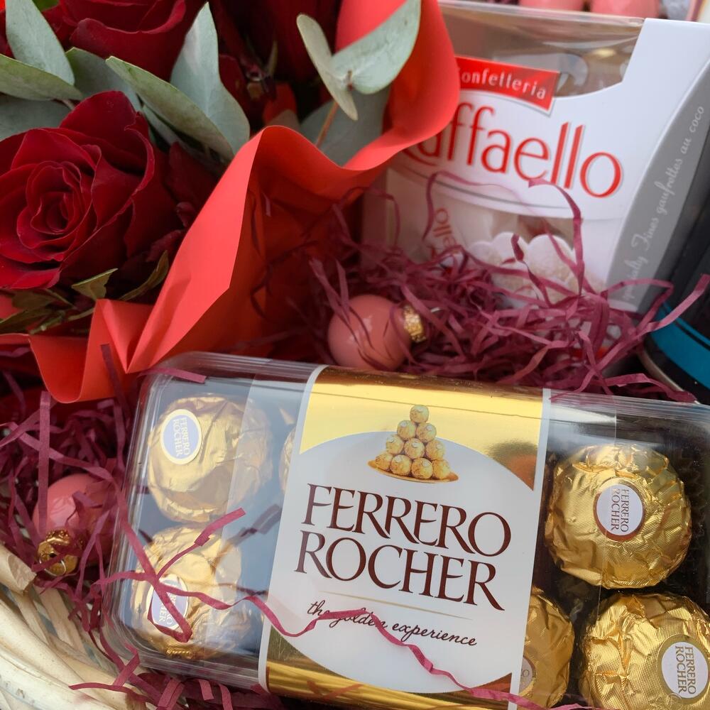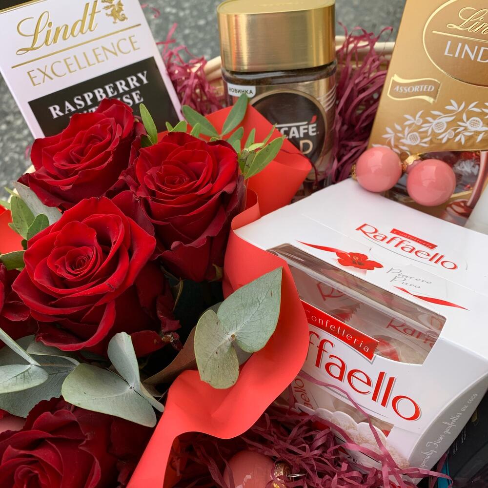 Чай – 1 шт.Конфеты rafaello – 1 шт.конфеты lindt lindor – 1 шт.Шоколад lindt – 1 шт.Кофе – 1 шт.Конфеты Ferrero Rocher – 1 шт.Шоколад DOVE – 1 шт.Роза – 3 шт.Корзина – 1 шт.