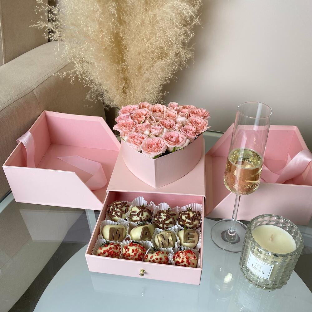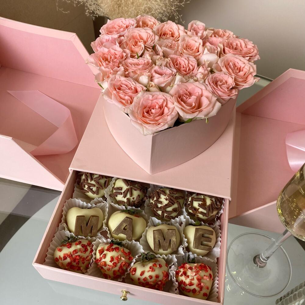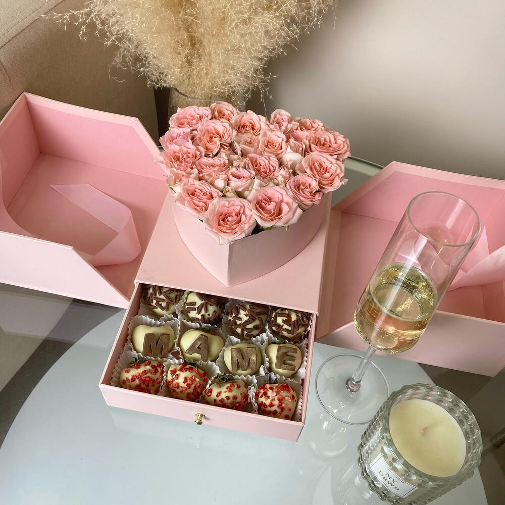 Подарочный набор “МАМЕ” в шкатулке с цветами и клубникой в шоколаде