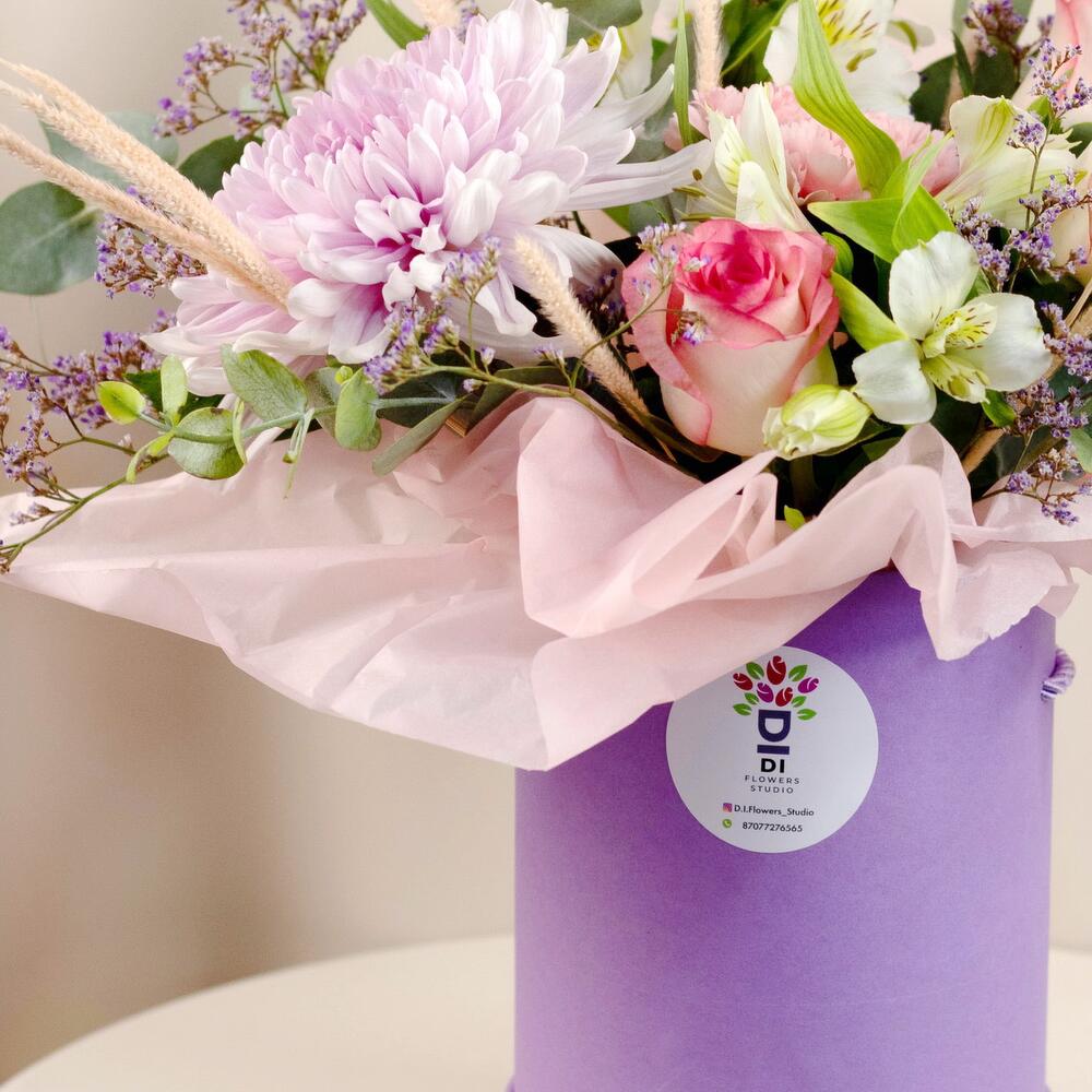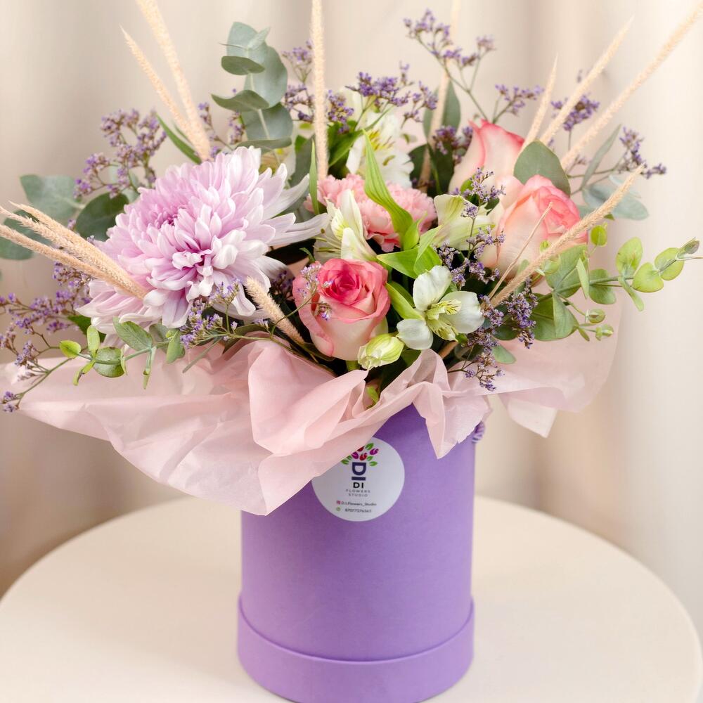 Хризантема – 1 шт. Роза – 3 шт. Альстромерия – 2 шт. Гвоздика – 2 шт. Флум – 1 шт. Лимониум – 1 шт. Эвкалипт – 1 шт.