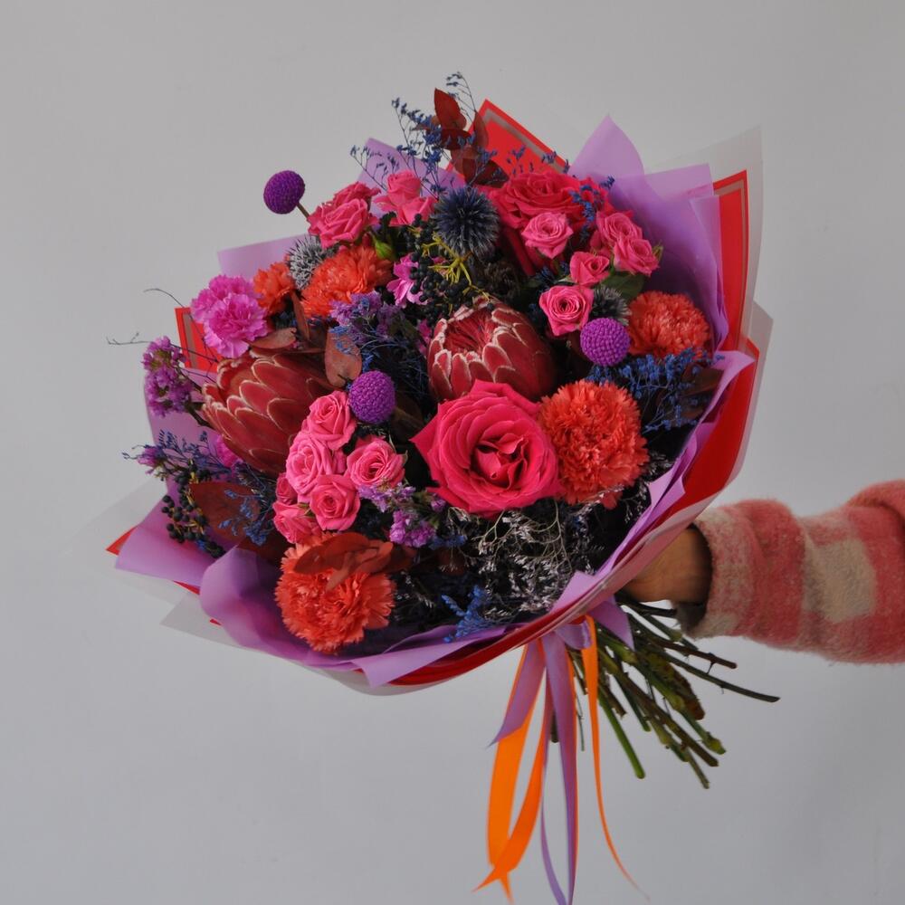Протея и розы в ярком букете «Луна моей жизни»