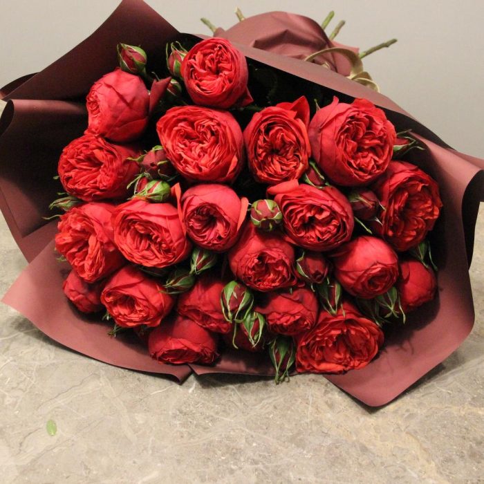 Роза пионовидная Red Piano – 19 шт.Упаковка дизайнерская – 2 шт.Лента атласная – 1 шт.