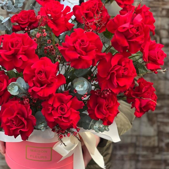 Эвкалипт – 5 шт. Лента атласная – 2 шт. Коробка шляпная – 1 шт. Фисташка – 2 шт. Хамелациум – 5 шт. Роза голландия – 25 шт. Декор – 2 шт. Оазис флористический – 2 шт.