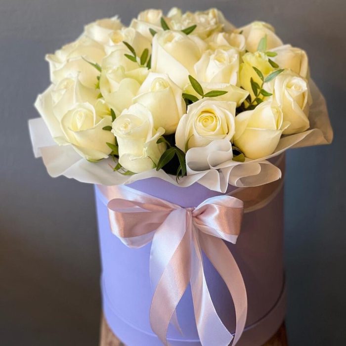 розы белые – 25 шт.Оазис флористический – 2 шт.Шляпная коробка – 1 шт.Пленка матовая – 1 шт.Лента атласная – 2 шт.работа флориста – 1 шт.
