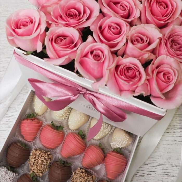 Шкатулка с розами и клубникой в шоколаде