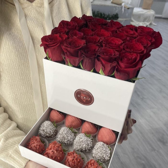 Шкатулка с кустовыми розами и клубникой в шоколаде