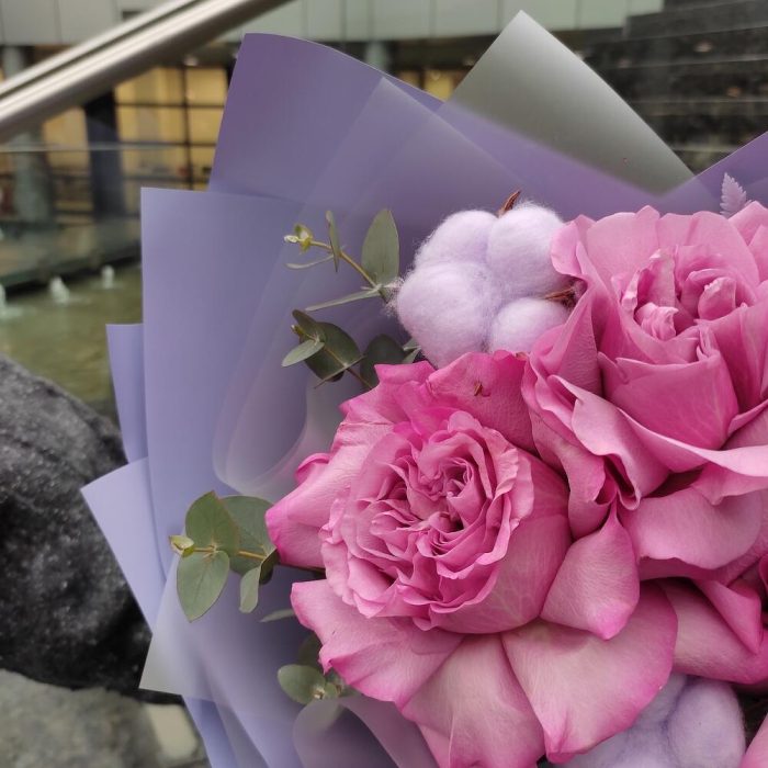 Роза пионовидная – 3 шт.Хлопок – 2 шт.Эвкалипт – 1 шт.Папоротник – 1 шт.Упаковка дизайнерская – 2 шт.Лента атласная – 2 шт.