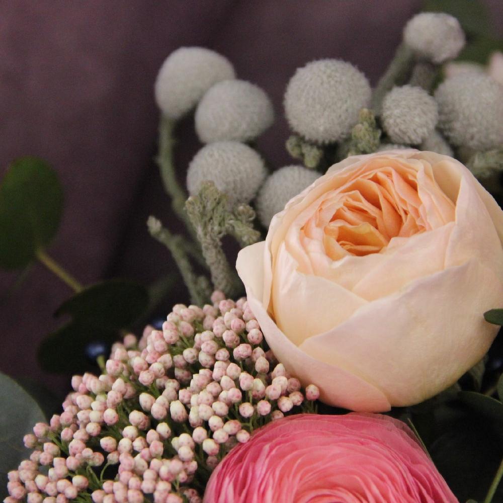 Ранункулюс – 4 шт.Роза Эквадор – 3 шт.Роза пионовидная дэвида остина – 3 шт.Твидия – 3 шт.Озотамнус – 2 шт.Бруния – 1 шт.Аспарагус – 2 шт.Эвкалипт – 7 шт.Вибурнум ягоды – 3 шт.Бумага – 3 шт.Лента атласная – 2 шт.