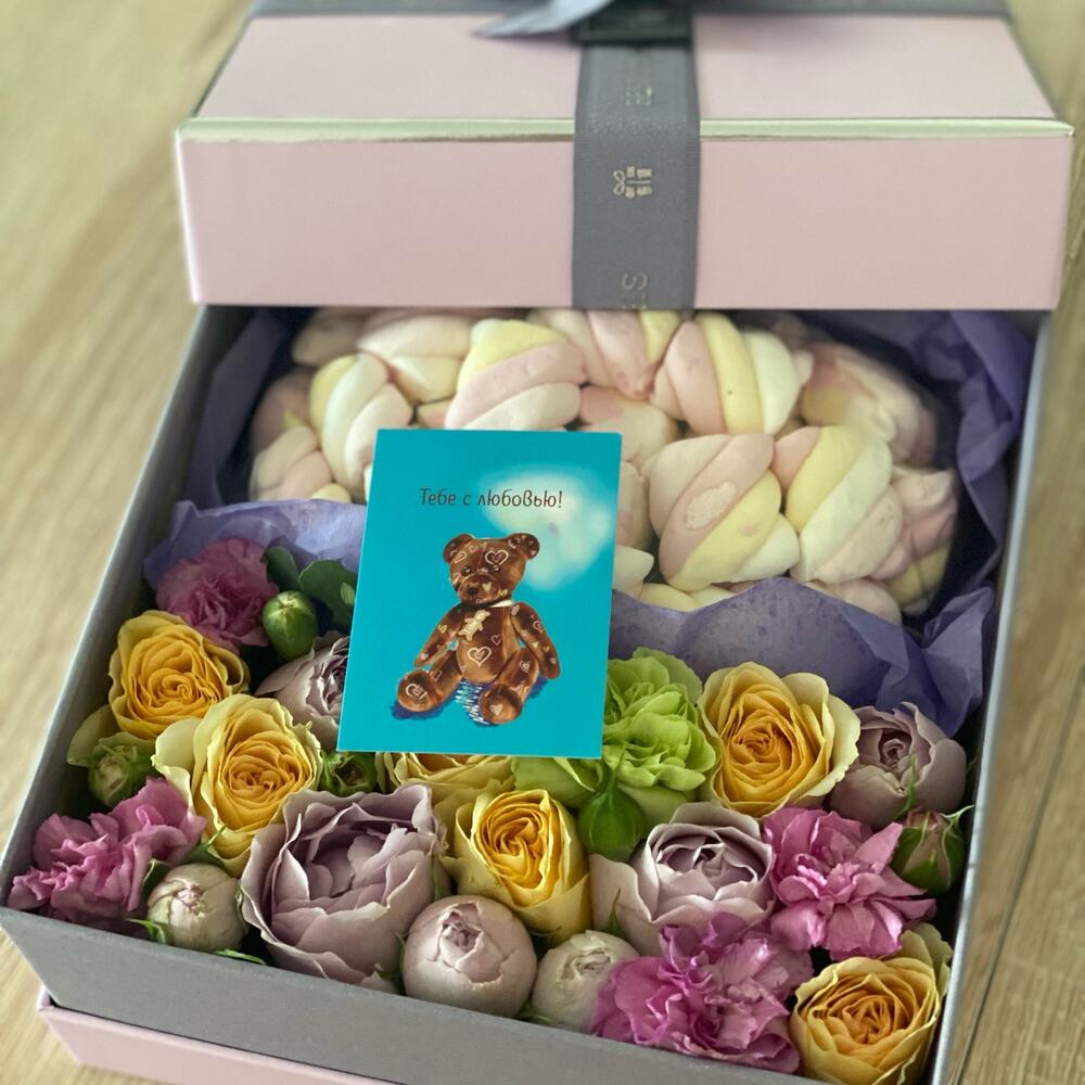 Кустовая роза – 4 шт.Зелень – 1 шт.Оазис – 1 шт.Коробка – 1 шт.Маршмеллоу – 100 гр.Одноголовая роза – 3 шт.