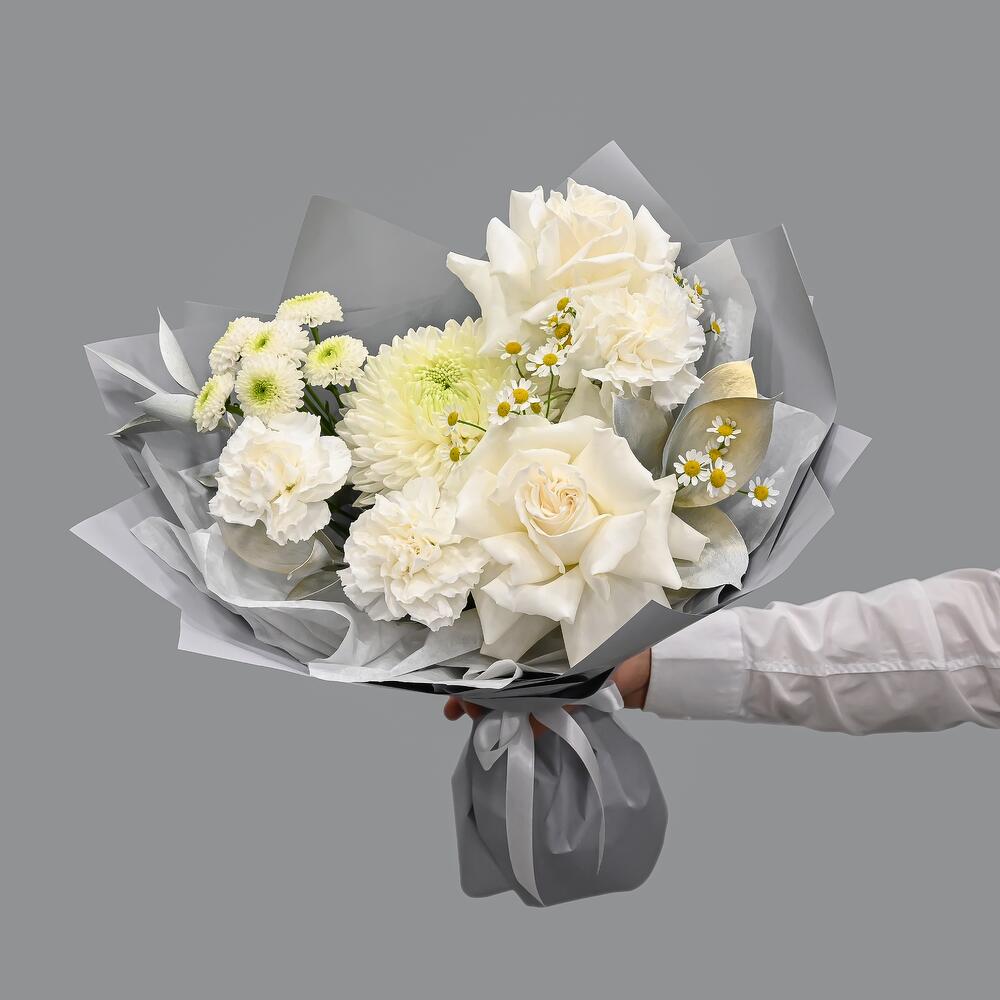 Стильный букет в бело-голубой цветовой гамме. В составе французские розы, сортовая гвоздика, тюльпаны, кустовая ромашка и пышная одноголовая хризантема.Флористы студии Цветочный Этикет собрали его из самых свежих цветов, тщательно продумав состав. Букет готов удивлять … Показать ещёкрасотой своего получателя! Станет идеальным подарком для любимой женщины, дочке или мамы, на День Рождения, юбилей, свадьбу и другие торжественные мероприятия. С букетом вы получите конверт с открыткой, в которой мы напишем любое пожелание, инструкцию свежести и средство для продления жизни срезанных цветов.