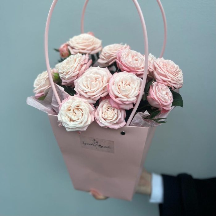 Роза кустовая Бомбастик – 4 шт.Тишью – 2 шт.Оазис флористический – 1 шт.сумочка с ручками – 1 шт.