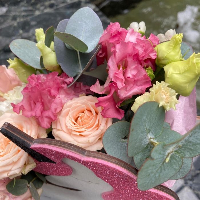 Волшебный сон – композиция из лизиантуса, роз и ваксфлауэра в декоративном ящике «Единорог»