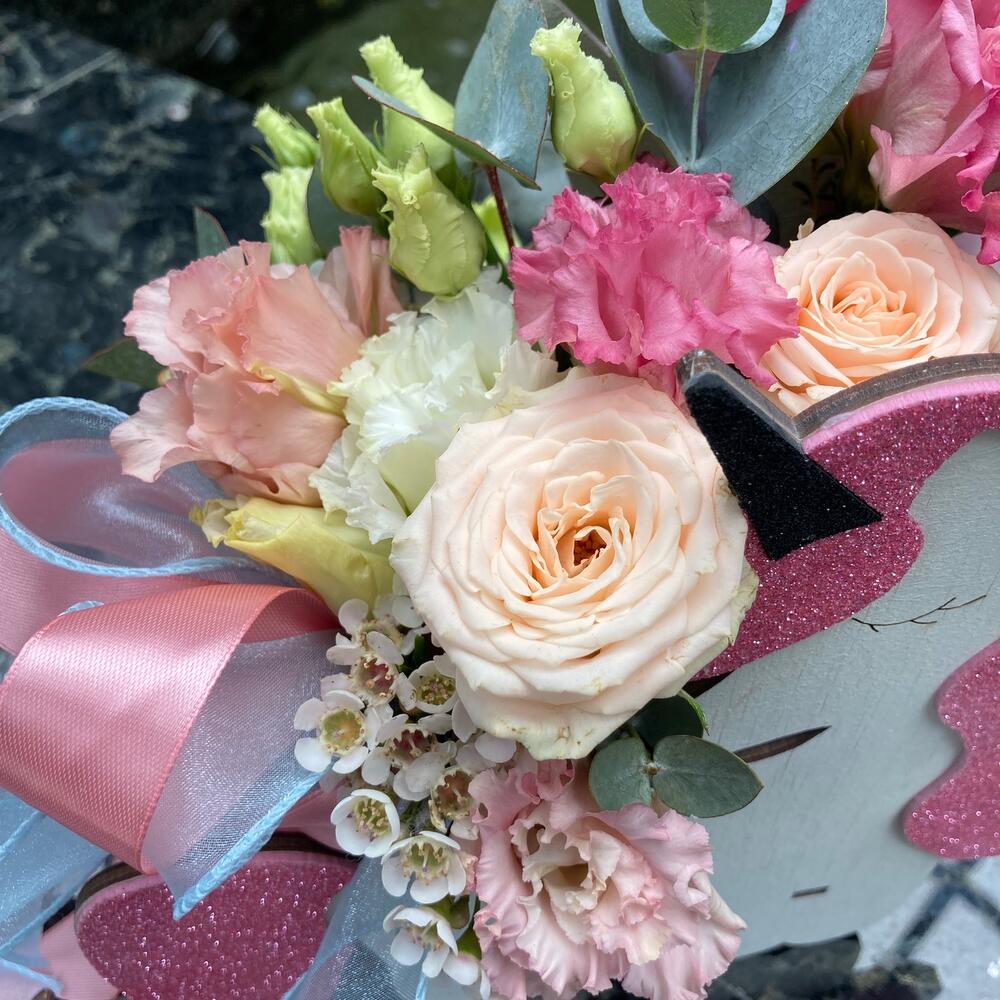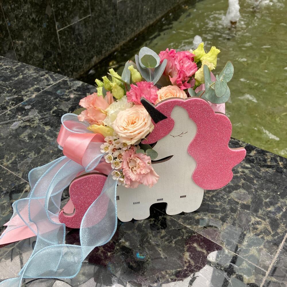 Волшебный сон - композиция из лизиантуса, роз и ваксфлауэра в декоративном ящике «Единорог»