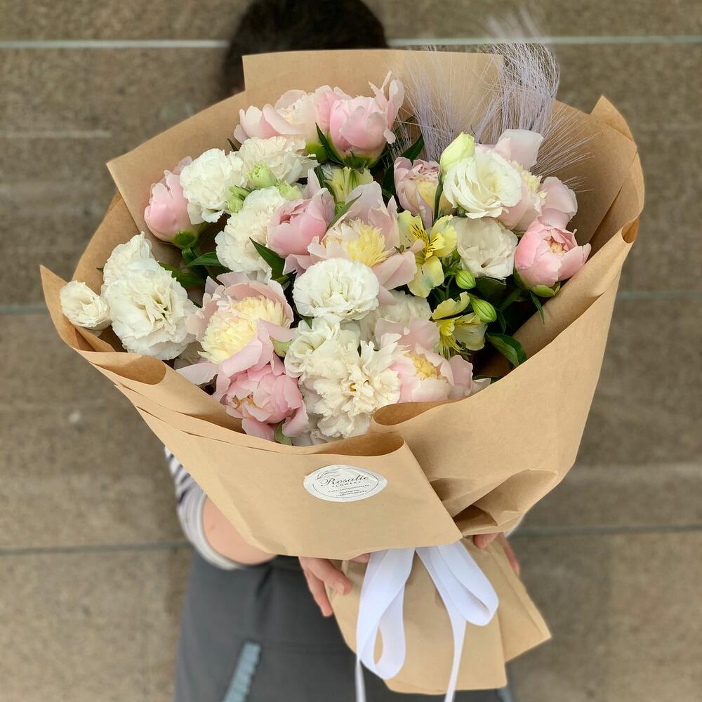 Гвоздики, Лизиантусы, Пионовидные розы, Розы, Сухоцвет