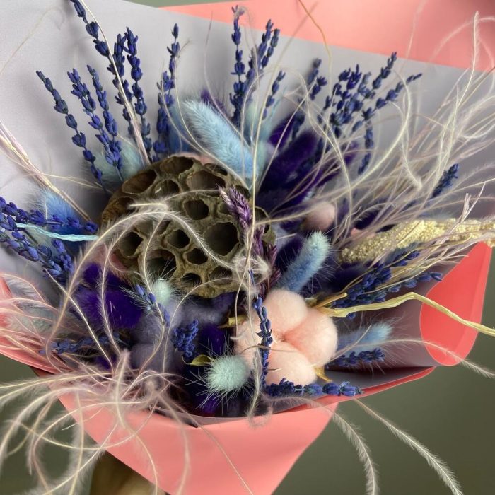 Хлопок – 7 шт.лагурус (сухоцвет) пучок – 2 шт.Лаванда (сухоцвет) пучок – 2 шт.ковыль пучок – 1 шт.Лотос сухой – 1 шт.Декор – 3 шт.Упаковка дизайнерская – 1 шт.