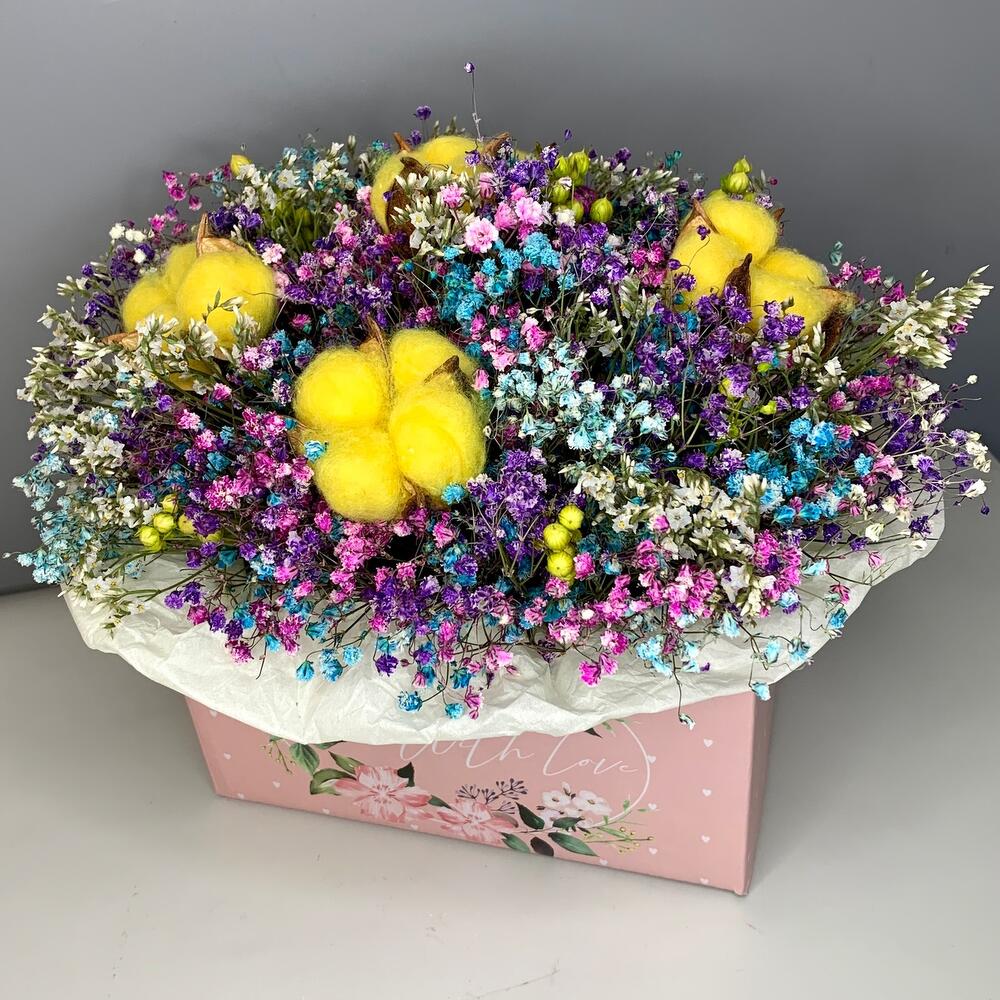 Разноцветная композиция из сухоцветов в нежной коробке