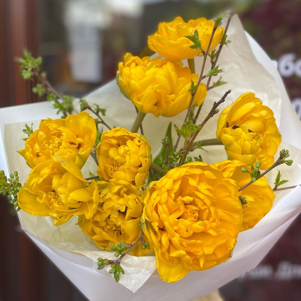 Тюльпан пионовидный – 9 шт.ветви цветущие – 9 шт.Упаковка дизайнерская – 5 шт.Лента органза – 1 шт.